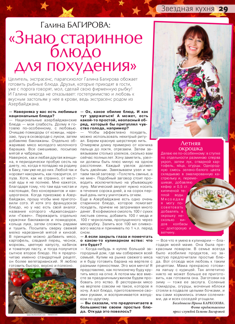 Целитель, экстрасенс, парапсихолог Галина Багирова обожает готовить рыбные блюда. Друзья, которые приходят в гости, уже с порога говорят, мол, сделай свою фирменную рыбку! И Галина никогда не отказывает: гостеприимство и любовь к вкусным застольям у нее в крови, ведь экстрасенс родом из Азербайджана.